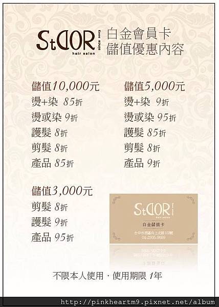 儲值三千,染燙就沒有打折,護髮9折,剪髮8折,產品95折